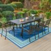 Turn your backyard into a unique, comfortable getaway with this stylish MF Studio outdoor patio furniture set. Perfect for entertaining, hosting a family dinner, gathering or a party is a breeze all summer long. The set includes 1 expandable dining table and 8 armchairs. Crafted with heavy-duty steel frame with E-coating finish, this patio set offers supportive structure and stands up to outdoor elements for reliable long-lasting strength. The chair features clean-lined apperance, well-made structure and stackable design which is convenient for moving and storing. The table is designed with an extension, length up to 84″, suitable for 8-person when additional space is needed.