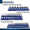 MichaelPro MP014002 Magnetic Socket Holders (for Metric sockets) can store up to 75 of your 1/4″, 3/8″, and 1/2″ drives Metric sockets. That means you can get all your sockets organized and tidy. No more messy tools! You will get sockets holder trays in the package. That includes 26pc 1/4″ Dr. Magnetic Socket Tray, 30pc 3/8 Dr. Magnetic Socket Tray, 19pc 1/2″ Dr. Magnetic Socket Tray. Visible socket labels are available so that you can store and retrieve sockets at ease. Each tool socket organizer is equipped with a strong rubberized magnetic base that attaches easily to the side of your tool chest or cabinet, yet leaving your toolboxes, drawers, cabinets, or any surfaces scratch-free. No one likes searching for sockets in a messy workspace. These magnetic socket holders organize and protect your sockets from a jumbled mess and getting lost from job to job. Rest assured that your sockets will leave this socket tray only when you need it for your works. These premium socket holders are made from sturdy polypropylene and are designed to be durable and long-lasting. Made in Taiwan, where it’s being widely recognized for its dedication to producing premium quality tools, these magnetic socket trays are definitely one of your essentials. Our customers trust our tools to be of quality ones. Your socket organizers are backed by our Limited Lifetime Warranty. If you experience any issues, simply contact us for assistance.