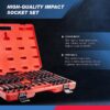 – 1/2 IMPACT SOCKET SET: The high impact grade components of this master kit are constructed of drop-forged premium chrome vanadium Cr-V steel to withstand extreme levels of torque changes against fasteners.