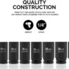 – SPECIAL DEEP DESIGN: Each socket has a unique design that grips the flat sides of fasteners rather than the corners to prevent stripping and rounding off of bolts. With a high torque impact gun, each Metric socket will torque the most stubborn fasteners.
