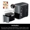 – DoubleStack Air Fryer, (2) 5 Quart Baskets, (2) Nonstick Crisper Plates, (2) Stacked Meal Racks, 20 Recipes, Additional Meal Options & Cooking Charts.