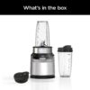 – 1100-peak-watt blender motor base, Pro Extractor Blades assembly, 24-oz. single-serve cups, 2 spout lids & Inspiration Guide with 20 recipes