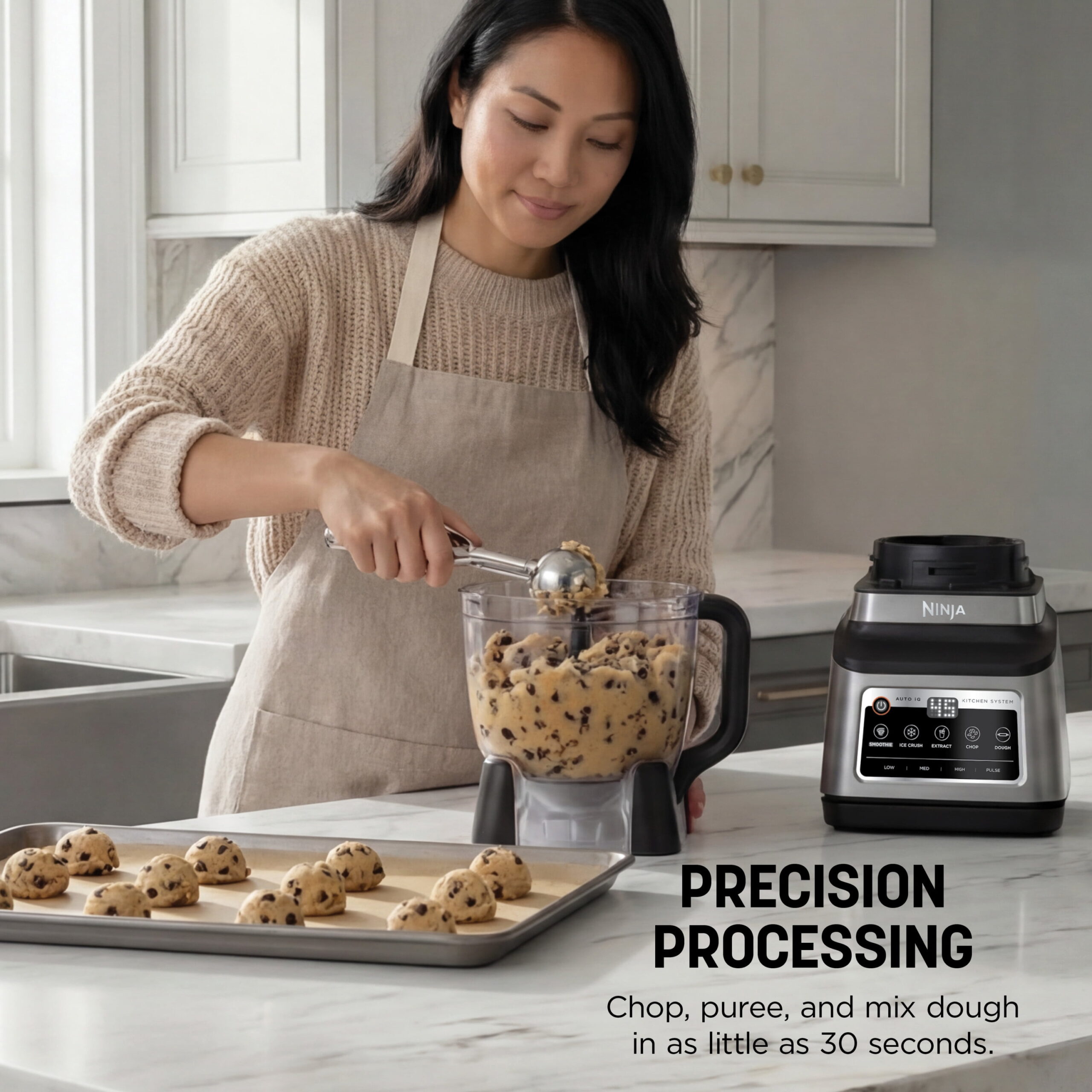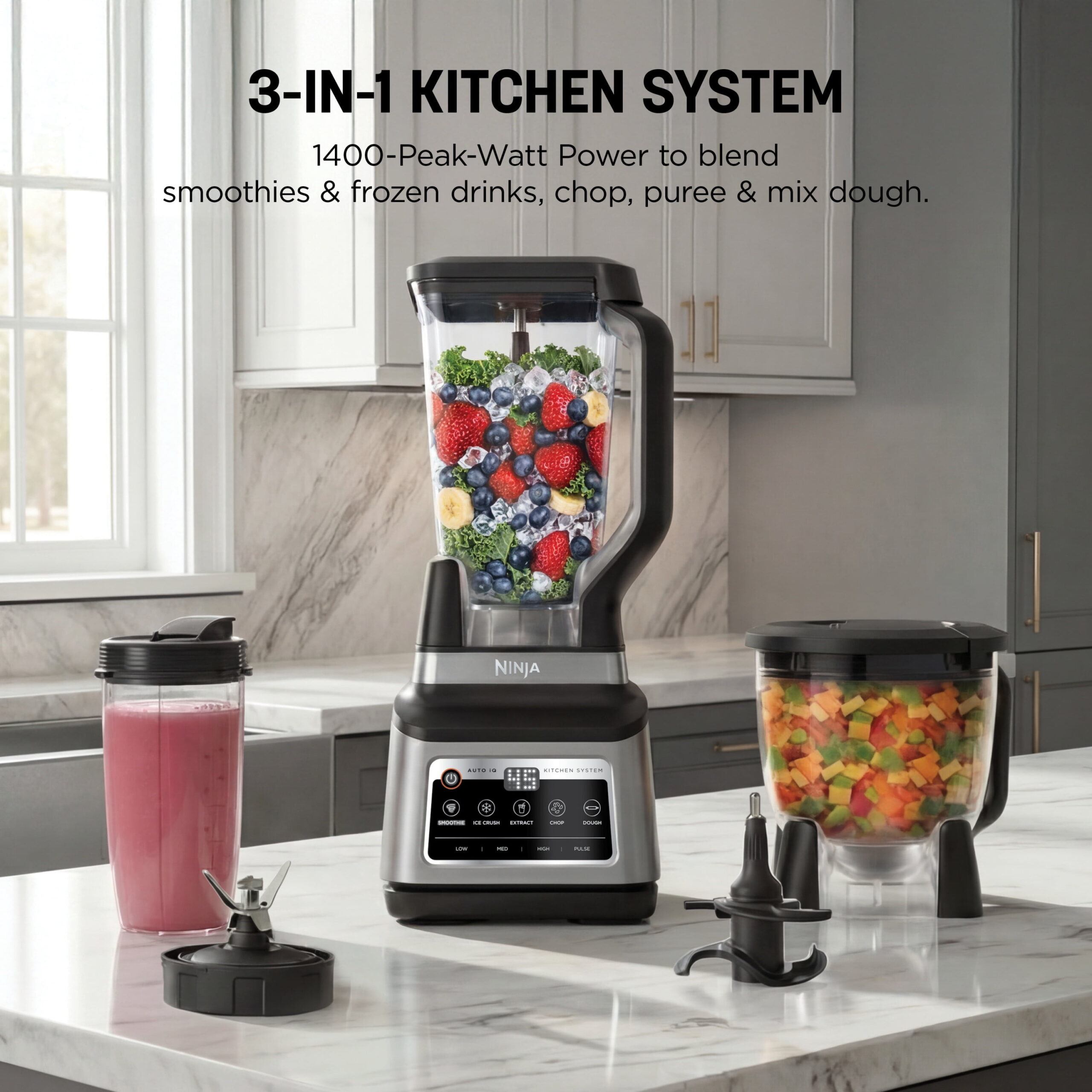 The Ninja Professional Plus Kitchen System with Auto-iQ features a new modern design and more functionality than Ninja’s original Professional Kitchen System.* Ninja Total Crushing Blades and Pro Extractor Blades Assembly give you perfectly crushed ice for your smoothies, frozen drinks, and nutrient extractions**. The 72 oz. Total Crushing Pitcher is great for making large batches for the whole family with 1400 peak watts of professional power. Plus, its single-serve cup with spout lid makes it easy to take delicious, nutrient-rich smoothies on the go. But don’t just stop at drinks the 64 oz. processor bowl provides precision processing for even chopping, smooth purees, and up to 2 lbs. of dough. Auto-iQ Technology provides preset programs that do the work for you, no guesswork required. *Versus BL770, based on the number of available blending programs **Extract a drink containing vitamins and nutrients from fruits and vegetables 64 oz. max liquid capacity