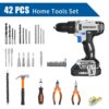 – 42 Pieces Household Tool Kit (1) cordless drill, (1) 20V battery, (1) fast charger, (1) storage bag, (1) tape measure, (1) needle nose pliers, (1) linesman pliers, (1) hammer, (1) ratcheting screwdriver, (1) flexible shaft, (12) screw driving bits, (1) screwdriver, (15) drill bits, (4) power nut driver bits.