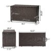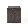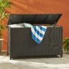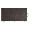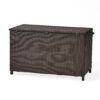 Bring a beautiful and practical accent to your outdoor space with this small brown wicker cushion box from. Protect your outdoor cushions from harmful sun or rain while maintaining easy access to your items with the lift-open lid.. . Use the side handles and wheels on this outdoor cushion box to move it where its needed most, or to bring it to a garage space to store your items for the season. Made with a sturdy aluminum frame, this storage box holds up to 25 pounds, allowing you to clear your patio area of items that aren’t frequently used.