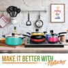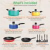 NutriChef NCCWCOR15 – Kitchenware Pots & Pans Set – Colorful Kitchen Cookware, Black Non-Stick Coating Inside, Heat Resistant Lacquer and Mixed Colors Outside (15-Piece Set). 15-PIECE SET: NutriChef 15-piece nonstick cookware set includes pink & blue sauce pot, yellow cooking pot, green dutch oven pot, black small fry pan, red medium fry pan, slotted spoon, slotted spatula, lids, pasta server, soup ladle, & potato masher. NON-STICK COATING: The PTFE/PFOA/PFOS-free non stick pots and pans sets cooking ware features a long-lasting black nonstick coating Inside for easy food release or tossing, cleaning & healthy cooking w/ mixed colors heat resistant lacquer exterior. COOL TOUCH HANDLE GRIPS: The pots set features cool-touch ergonomic & heat-resistant solid black Bakelite handles ensuring comfortable & safe cooking, stylish colorful kitchen cookware design, stain-resistant, & easy-to-clean dishwasher safe. SEE-THROUGH LIDS: The non stick cookware pots and pan set are equipped w/ see-through multi-sized tempered glass lids w/ vent holes that allow steam to escape and includes heat-resistant kitchen tool utensils for hassle-free cooking