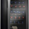 NutriChef Recessed Handle Wine Chilling Refrigerator Cooler(28) Wine Bottle Capacity Digital Touch Button Display Panel Adjustable Temperature Control Celsius and Fahrenheit Selectable (°C/°F)Integrated LED Light with Power ControlSensitive Touch Screen Control Button on Glass Blue Temperature Display Glass Door with Plastic Door Frame Built-in Circulation Fan & Ventilation Grill Includes Contoured, Polished Chrome Wine Racks Free-Standing Design for Floor, Table, or Countertop Placement Low Noise Operation