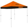 Show your colors on game day with the Economy Canopy tailgate tent. When set up it, measures 9 ft. x 9 ft., the size of a standard parking space. It is made of durable powder-coated steel and water-resistant polyester. The top and valances come in alternating team colors and feature two logos on alternating sides. It has a 6 ft. head clearance and stands 9 ft. at the tallest point. It has three height adjustment levels, and no-pinch, easy-to-push buttons. It takes about three minutes for two people to set up. It comes with a drawstring carrying bag, eight ties and eight stakes. It weighs 29 pounds. Weight bags are sold separately for use on concrete.