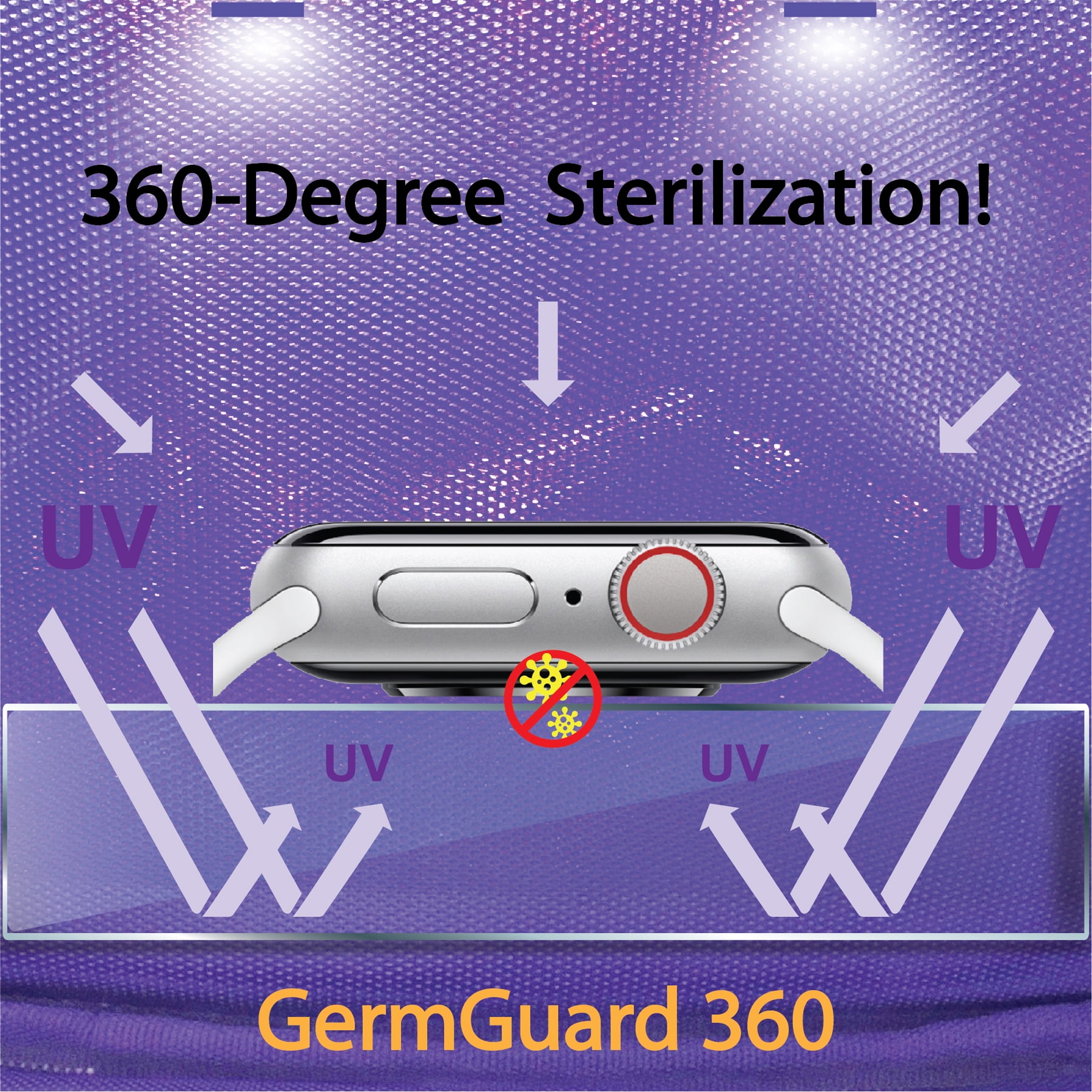 - GermGuard 360 reflects the UV light to eliminate germs and bacteria on the bottom of your items, not just on the top as with most sanitizer bags. 360-Degree Sterilization!