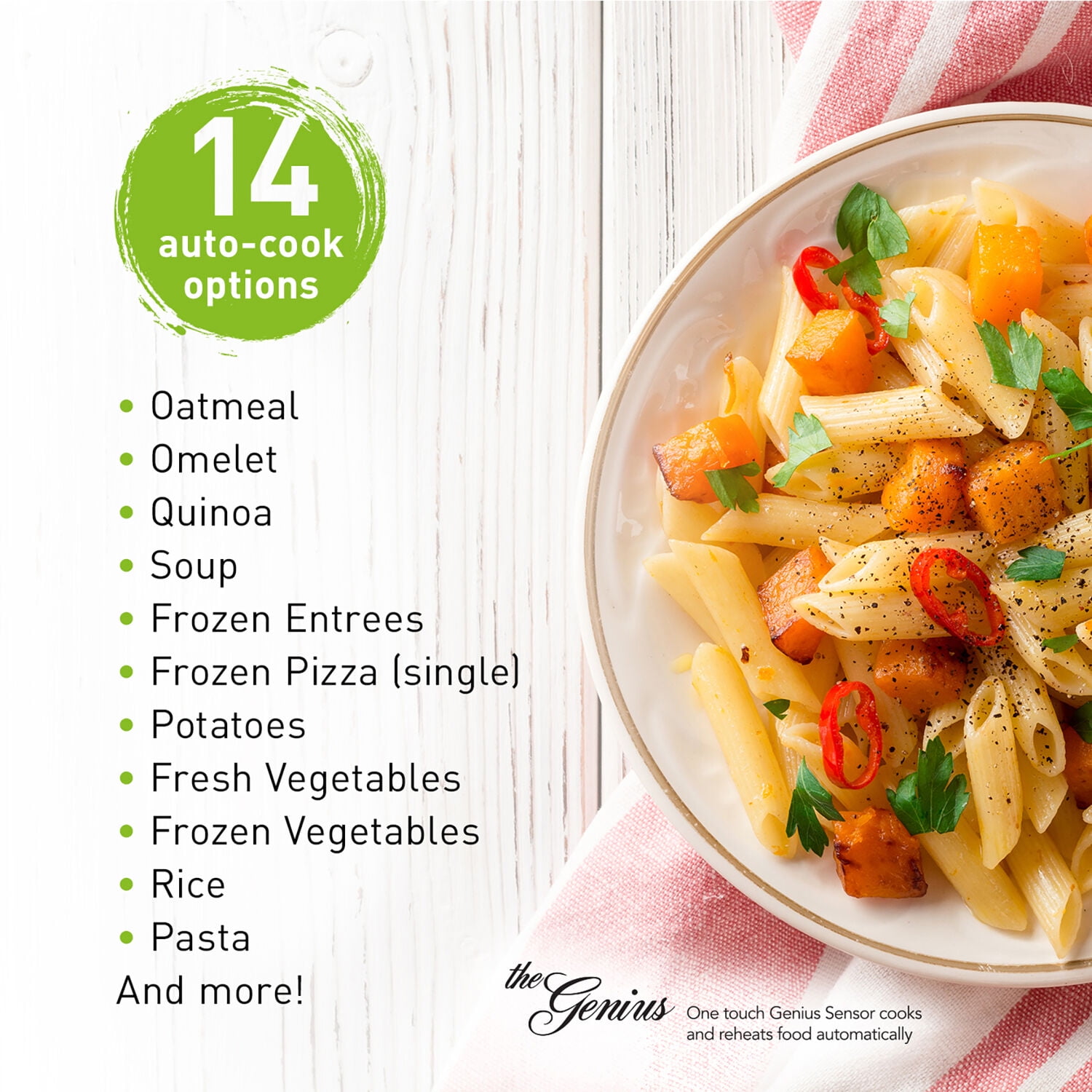 - Genius one-touch sensor cook and reheat eliminates guesswork