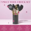 – ICONIC TOOL SET EVERY KITCHEN NEEDS: This gorgeous set includes a silicone spatula, silicone solid spoon, silicone slotted turner, silicone tongs, and stainless steel ladle, wire whisk, tool crock. Available in pink with gold crock and charcoal.