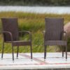 Meet the new modern workhorses of party season. The Patio Sense Morgan Outdoor Wicker Chair – Set of 4 includes streamlined, stackable seats you ll use at the dining table, by the pool, on the porch, or patio during family get-togethers and cocktail fetes. Each of these four high-backed chairs is crafted with a lightweight aluminum frame that’s wrapped in dense all-weather resin wicker that s quick-drying and warmly shaded in brown. Curved arm rests soften the design s crisp corners. When it s time to tuck in for cold weather, simply stack the chairs away for space-saving storage, or bring them indoors for all the holiday fun. A manufacturer s one-year limited warranty is included.