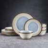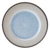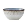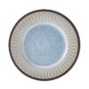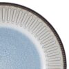 – Features a bright color palette with contrasting patterns on the rims and centers in shades of tan and blue, and a reactive glaze finish
