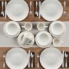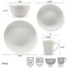– Four 10.5-in. dinner plates, four 8.25-in. salad plates, four 21-oz bowls & four 12-oz. mugs