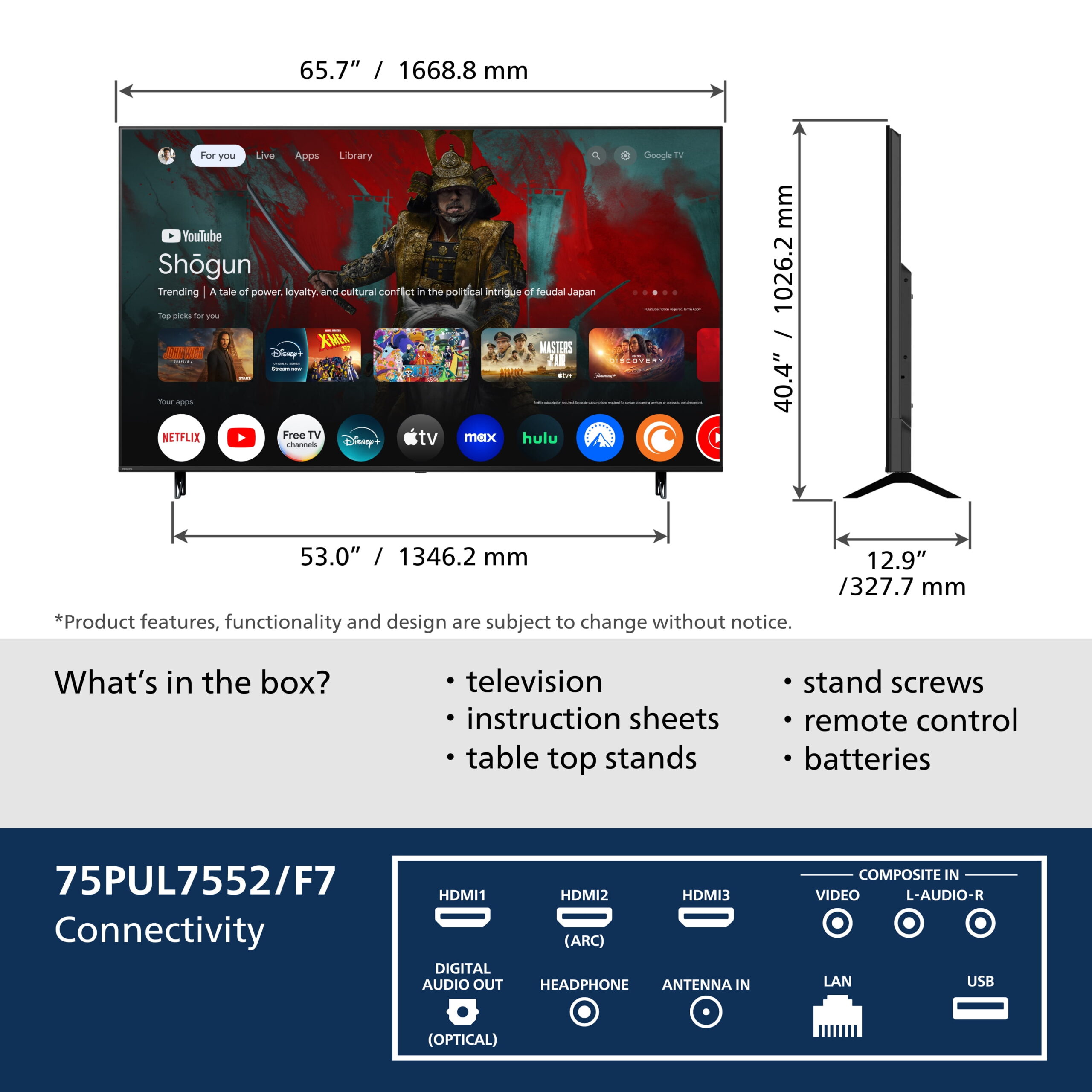 Watch what you love, control it with your voice. The new Philips 75″ Class 4K Ultra HD (2160p) Google Smart LED TV (75PUL7552/F7) brings together movies, shows, live TV and more from across your apps and organizes them just for you. Ask Google to find movies and shows, answer questions, control smart home devices, and more, with your voice. Enjoy the beauty of 4K Ultra HD TV and see more of what the director intended. Find the entertainment you love with help from Google.