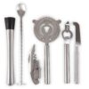 – 1 Cherry-Stained Acacia Box; 6 Stainless Steel Cocktail Sticks; 1 Stainless Steel Cocktail Stick Caddy; 1 Stainless Steel Hawthorne Strainer; 1 Stainless Steel Tong; 1 Stainless Steel Bar Spoon; 1 Stainless Steel Double-Sided Jigger; 1 Brushed Stainless Steel Muddler with Plastic Head; 1 Stainless Steel Corkscrew; 1 Stainless Steel Two-Piece Shaker; 1 Stainless Steel Paring Knife; 1 Stainless Steel Bottle Opener; 1 Glass Ice Bucket with Stainless Steel Handle; 1 Mixing Glass with Pour Spout, (8-oz.); 1 Marble Cutting Board