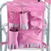 – An armrest caddy hangs from the side of the chair and includes a variety of storage pockets