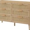 PORKISS 6 Drawer Dresser, Wood Dresser Organizer with 6 Rattan Drawers, Modern Chest of Drawers for Hallways, Living Room, Bedroom, Natural