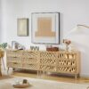 Transform your space with the PORKISS 6 Drawer Dresser, a versatile storage solution for hallways, living rooms, or bedrooms. With a natural wood finish and woven rattan drawers, this modern chest of drawers offers a clutter-free organization while adding a stylish touch to your decor. Its sturdy wooden frame and multifunctional design make it a must-have piece, doubling as a TV stand or side table, and easily enhancing any hallway or living room.