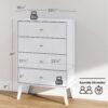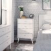 This Prepac Milo Mid Century Modern 4-Drawer Vertical Chest, White is an ideal bedroom storage solution for smaller bedroom spaces. Four drawers run smoothly on metal glides, offering easy access to storage for clothing and bedroom items, all in a compact footprint for any bedroom size. The tapered solid wood legs give this dresser a boost of retro-chic style. The 4-drawer chest is made with durable engineered wood and features brushed brass knobs on each drawer for easy access to all your belongings. This fashionable piece combines style and function in a timeless mid-century modern design that will complement a variety of decor styles; pair with other products from the Milo collection for a complete look.