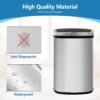 Introducing our cutting-edge, touchless waste bin with a high storage capacity, elegantly crafted in sleek silver stainless steel. This groundbreaking solution revolutionizes waste management in your home or office, prioritizing efficiency and cleanliness. Bid farewell to manual operations and embrace the future of waste disposal. Our trash can incorporates state-of-the-art infrared motion sensing technology, setting new benchmarks in style and innovation. The infrared sensor exhibits exceptional sensitivity, allowing for swift and effortless opening in a fraction of a second. Within a mere 4 seconds, the bin automatically closes, maximizing convenience and minimizing energy usage. Constructed from premium stainless steel, our trash can not only offers visual appeal but also excels in functionality. Its sturdy design ensures waterproof and rust-proof properties, guaranteeing long-lasting performance. With a generous capacity of 13 gallons, this bin effortlessly accommodates significant quantities of waste, reducing the need for frequent emptying.