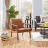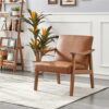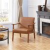 This pair of faux leather accent chairs combines a mid-century modern style with a warm look that will complement any home decor. The armchair features a solid wood and manufactured wood frame for sturdiness and stability. With the cushioned seat and backrest, you can enjoy your leisure time on it cozily and comfortably. The light brown artificial leather finish combined with the wooden color of the frame, bringing a charming and retro vibe to your room. Ideal for uplifting your living room, bedroom, dining room, kitchen, guestroom or creating a corner for relaxation and entertainment.