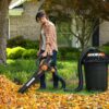 – [Flexible hose] Leaf collection with a flexible 8 to 16 ft. hose with drawstring mesh hood which fits over most 32-96 gallon waste containers and leaf bins for no-touch, high capacity leaf collection.