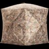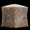 A new take on a fan favorite. The Rhino 180 features two panels that offer true head-to-toe 180-degree visibility through the full-panel see-through mesh system. Hunters can see out but the game can t see in. This improved system cuts down on exterior glare without compromising the hunter s ability to see out or stay concealed. Enjoy the view and ample shooting opportunities through the adjustable windows with a silent slide window system strategically designed to fit the needs of bow and gun hunters alike. The large 58 x 58 footprint can fit up to three hunters, while the 66 height gives plenty of head clearance. Each blind includes a backpack-style carry bag, rope tie-downs and ground stakes for a secure setup. Available in Mossy Oak or Realtree camouflage.