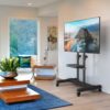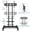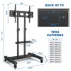 – Rolling TV stand on wheels maximum VESA pattern of 600 x 400 mm, ensuring a secure and stable display.