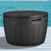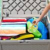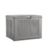 The Rubbermaid Deck Box features a basket weave pattern to complement decor. This deck box has 69% fewer parts and is much faster and easier to assemble then previous Medium Deck Box Model. There is plenty of storage space inside for patio cushions, yard supplies, gardening tools, pool accessories and more. The lid offers a flat surface area for serving or seating space, plus it has easy-access lid hinges that open and close with just a light touch.