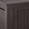 Keep your deck neat and tidy and have a place for all of your things with the Rubbermaid Patio Chic Outdoor Cabinet Style Wicker Storage Deck Box. Crafted out of durable wicker material, this cabinet-style storage box is designed to offer simple storage and complement your other outdoor furniture. It features ample storage space and is a great spot to store things like couch/chair cushions, garden supplies, grilling accessories, kids’ toys, and more. This deck box is made from weather-resistant material and won’t break down due to weather elements like sun, rain, and snow. Unlike imitator deck boxes, this model, like all Rubbermaid deck boxes, are made .. Don’t settle for a clunky or unorganized back patio. Instead, keep things tidy with the Rubbermaid Patio Chic Outdoor Cabinet Style Wicker Storage Deck Box.