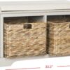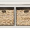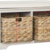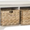 Sit back and relax. This charming storage bench with vintage white pine wood frame and linen upholstered seat is perfect for changing shoes in an entry hall, and its woven baskets can hold towels and other necessities in a master bath. A versatile piece in any room.