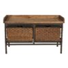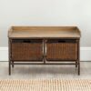 - Lower woven drawers provide storage options.