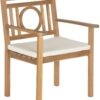 Resort chic styling defines the classic elegance of the Montclair 5 piece dining set with contemporary circle cut out motif on chair backs and slatted seats and table top. Masterfully crafted of acacia wood in natural with beige all weather cushions.