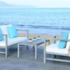 The perfect pairing of form and function, this contemporary 4-piece outdoor set was inspired by the home of LA’s top interior designer. Crafted in a grey hue, its sleek lines are illuminated with white upholstery that pops with complementary accent pillows.