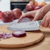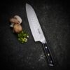 – Edge is sharpened at 10°-15° per side, ensuring a razor sharp blade edge. The long, wide blade of the chef knife is specifically designed with a curved edge, so it rocks back and forth on a cutting surface