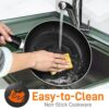 – The non-stick kitchenware has tempered glass lids with vents for steam to escape