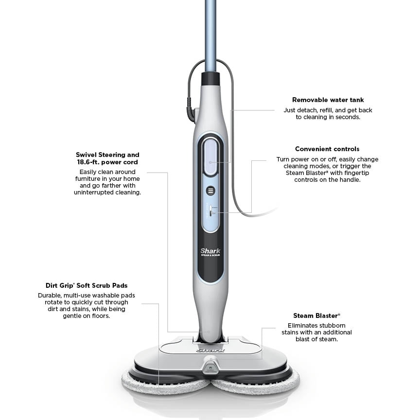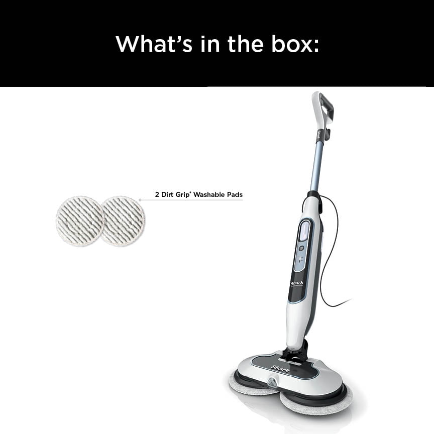 - WHAT’S INCLUDED: 1 Shark® Steam and Scrub steam mop and 2 machine washable Dirt Grip® Pads