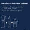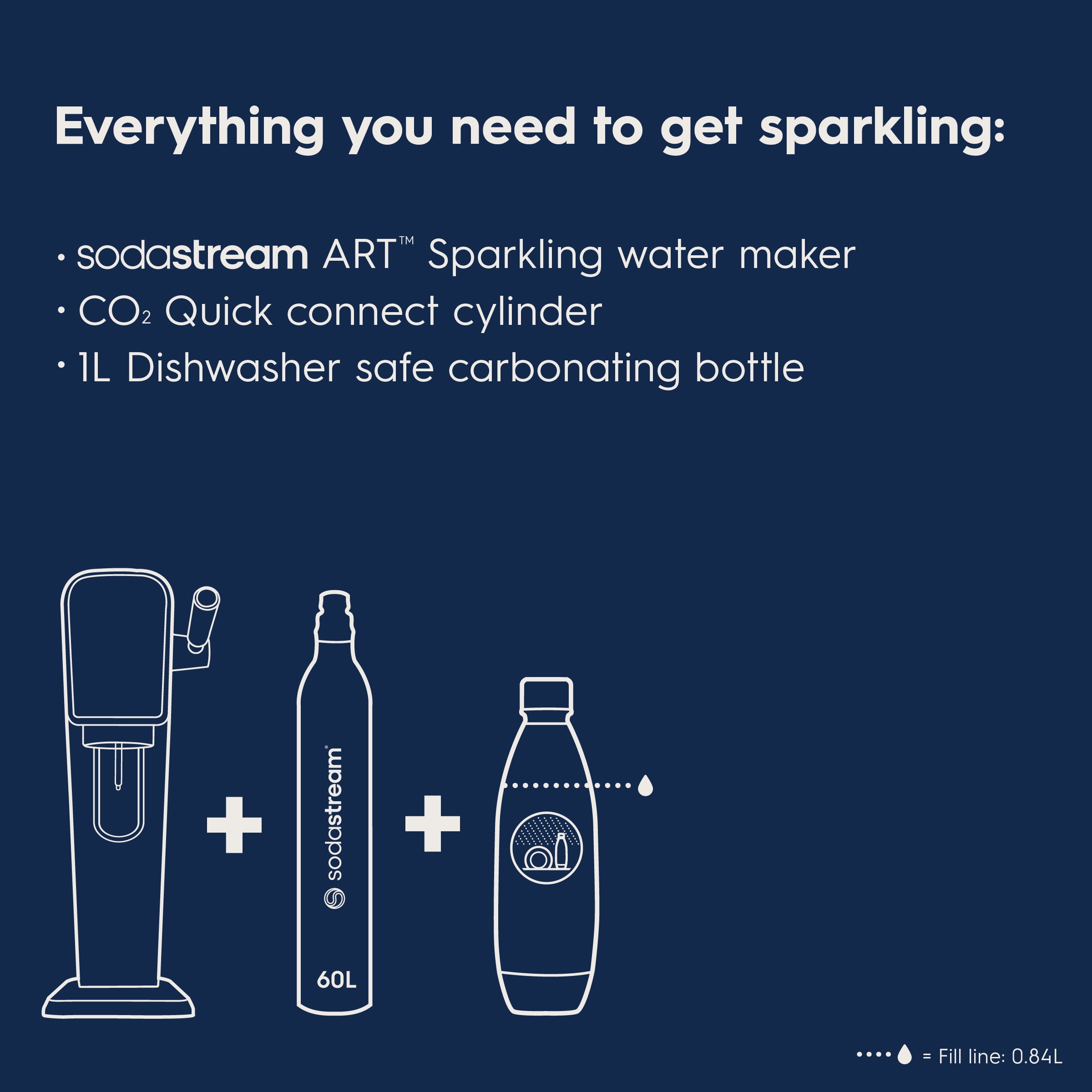 - The kit includes everything needed to start sparkling today – just add water (1) Art Sparkling Water Maker, (1) Pink Quick Connect 60L CO2 Cylinder and (1) 1L Dishwasher Safe Carbonating Bottle* (*840ml to fill line)