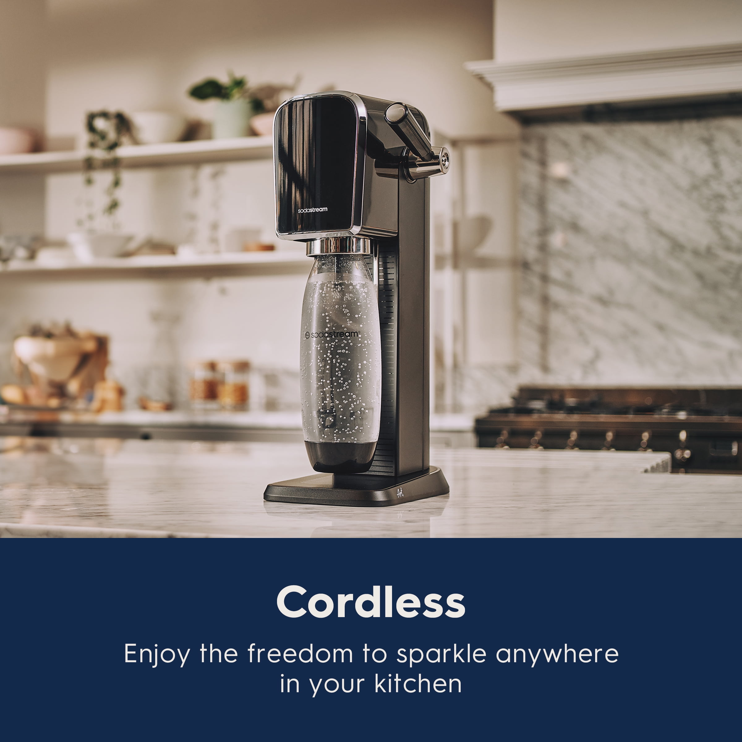 SodaStream Art Sparkling Water Maker celebrates the art of making your own fresh sparkling beverages at home. With a push of the lever, turn flat water into fresh sparkling water and customize it to your liking. The Art features a retro-looking design along with a unique carbonating lever. Manual carbonation, no batteries required.