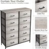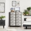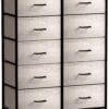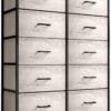 Keep your household clutter neatly tucked away in the Sorbus Portable & Tall 10-Drawer Fabric Dresser for Clothes. The lightweight design allows for effortless transport and reorganization. This chest of drawers features removable fabric drawer shelves that are great for storing clothing, toys, accessories, and any other items that are making a mess. Place this Sorbus dresser in a closet, next to your bed, use it as a tv stand, or add storage to a home office; the opportunities for organization are endless. When not in use, the fabric drawers can fold flat. For added convenience, these drawers wipe clean. This dresser is the perfect blend of rustic and modern design, featuring faux wooden fabric cubbies and contemporary black accessories. Getting organized has never looked better!