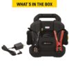 With the Stanley J15CF Jump Starter with Digital Compressor and USB Power Bank, you no longer need to dread roadside emergencies when your vehicle won’t start. This portable Jump Starter delivers serious power with 1500 peak amps. That’s enough power to jump-start a 12-Volt AGM, GEL or WET battery up to a V8 Engine; all without the need to use another vehicle. Simply connect the clamps to the battery, turn on the switch, and start your vehicle. The reverse polarity alarm will alert you when there is an improper connection. 15W USB-A and 25W USB-C power to charge devices on the go. A high-powered LED light and LCD screen readout with real-time information helps you work in the dark. This jump starter is equipped with a digital 120 PSI air compressor with AUTOSTOP technology and a Sure Fit nozzle to help inflate tires, sports equipment and more. For optimal performance, the unit should be charged every 30 days when not in use. Once used, the unit should be charged immediately overnight. Includes a limited 1-year manufacturer warranty. Metal powder-coated clamps for durability. New.