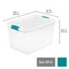 Need help getting organized Step up to the Sterilite 64 Quart Latching Box, featuring a modern space saving shape and an innovative hinging lid. Simply undo one latch and lift the lid for easy access, all with one hand. The other latch stays attached and acts as a hinge, even when the lid is opened all of the way. This size Latching Box is ideal for storing off season clothing, sporting equipment, boots, blankets and other bulky items around the home. The recessed lids allow same size storage boxes to stack neatly on top of each other to use vertical storage space efficiently. The 32 Qt and 64 Qt Latching Boxes use the same lid, allowing both the shallow and deep sizes to be stacked in same footprint. The overall assembled dimensions of this item are 23 3/4″ L x 16″ W x 13 1/2″ H.