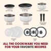 – Take Back Your Shelf Space: Say goodbye to cluttered cabinets. Stackable design saves up to 50% more space compared to T-fal fixed handle sets. This all-in-one set for cooking, baking, and serving is best for small kitchens, RVs, and other limited spaces.