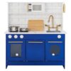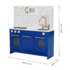 – Features openable oven and microwave doors, three turning oven knobs, two oven burners, two drawers, a sink with a gold faucet, and an under-sink cabinet to enhance your little ones play time