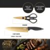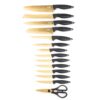 Thyme & Table 15-Piece Knife Block Set is a part of the Thyme & Table Essential Collection. Each knife is made of stainless steel with an ergonomic comfort grip. The knife block is made of Acacia wood and has a built-in knife sharpener. The 15-piece set includes: Stainless Steel Shears 8″ Chef Knife 8″ Bread Knife 8″ Carving Knife 7″ Santoku Knife 6″ Boning Knife 5″ Utility Knife Six 4.5″ Steak Knives 3.5″ Paring Knife