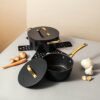 This exquisite set includes a 2qt sauté pan with a glass lid for versatile cooking, a 5.5qt stock pot with a glass lid for hearty soups and stews, a 2.5qt saucepan with a glass lid for delicate sauces, an 8″ fry pan for perfectly seared dishes, and a 10″ fry pan for larger culinary creations. Additionally, included are 4x cookware protectors to ensure your investment retains its pristine condition for years to come.