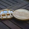- The board swivels open to reveal four stainless steel cheese tools with parawood handles