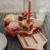 – Serving board, hard cheese shaver (7.4″); fork-tipped cheese knife (7.6″); pointed-tip cheese knife spreader (7″)