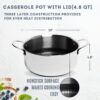 – EVEN HEATING: The casserole is made up of 3 layers, the first layer is stainless steel, layer 2 is aluminum, and layer 3 is stainless steel. The tri-ply construction allows for heat to be quickly absorbed and evenly distributed across the whole pan, allowing you to cook food faster without having to compromise on quality.